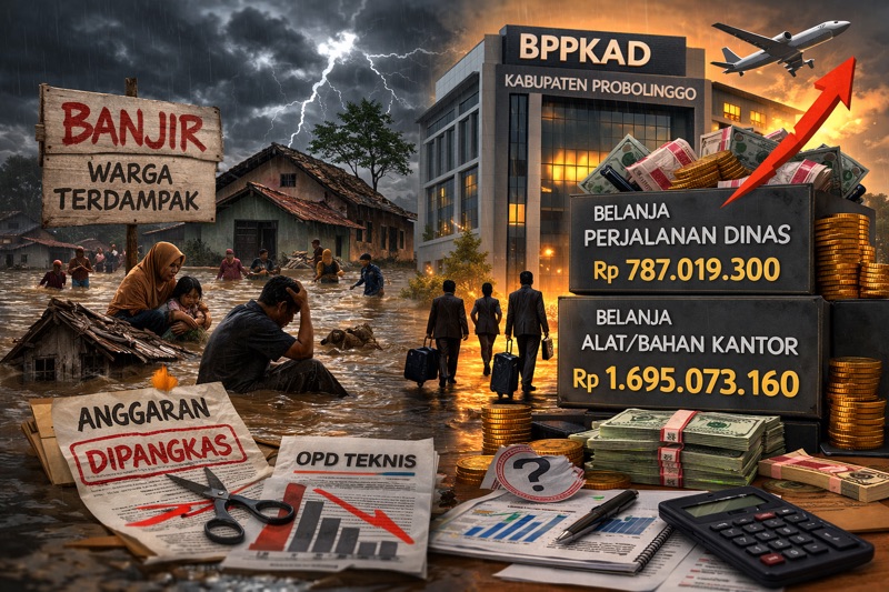 PROBOLINGGO - Seruan efisiensi anggaran dan pembatasan perjalanan dinas yang digaungkan pemerintah pusat di tengah tekanan fiskal nasional belum sepenuhnya tercermin dalam postur Anggaran Pendapatan dan Belanja Daerah (APBD) Kabupaten Probolinggo. Di saat sejumlah wilayah masih bergulat dengan dampak banjir berulang, alokasi belanja pada Badan Pengelolaan Pendapatan, Keuangan dan Aset Daerah (BPPKAD) Kabupaten Probolinggo justru menjadi perhatian publik.